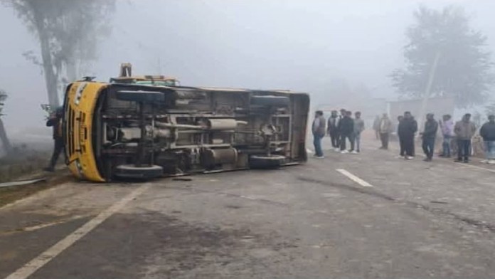 सिद्धार्थनगर। Siddharthnagar में घने कोहरे के कारण बड़ा सड़क हादसा टल गया। ढेबरुआ थाना क्षेत्र अंतर्गत नेशनल हाईवे पर मदरहिया गांव के पास एक साइकिल सवार को बचाने के प्रयास में मैजिक वाहन और मदरसे की बस अनियंत्रित होकर पलट गई। मदरसे की बस में करीब 38 स्कूली बच्चे सवार थे।