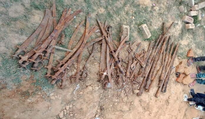 शाहजहांपुर। उत्तर प्रदेश के शाहजहांपुर (Shahjahanpur) जिले में खेत की जुताई के दौरान सकड़ों साल पुराने हथियार (weapons) का जखीरा बरामद हुआ हैं। इसमें सिंगल बैरल बंदूक की बैरल, तलवारें (swords), भाले और कई पुराने हथियार मिले हैं। बड़े पैमाने पर हथियार मिलने के बाद हर कोई हैरान रह गया। अचानक मिट्टी में हथियार (weapons) मिलने के बाद पुलिस अधिकारी (officers) मौके पर पहुंच गए हैं और जांच कर रहे हैं।